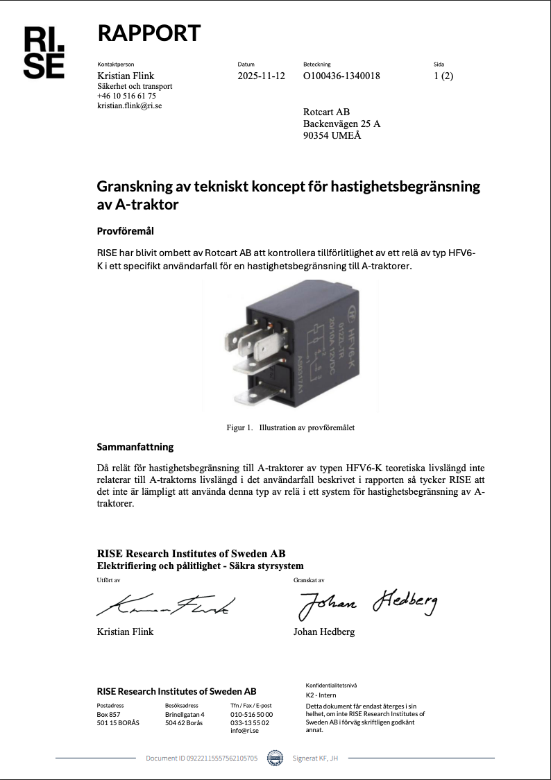 För att få en oberoende teknisk bedömning gav vi RISE i uppdrag att utreda om en vanligt förekommande relätyp för hastighetsbegränsning i A-traktorer är lämplig för detta användarfall. Resultatet var tydligt. I sin slutsats skriver RISE: